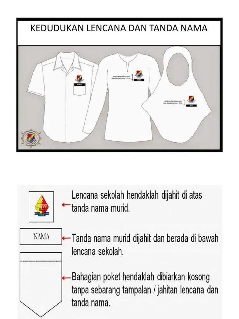 Pastikan semua barang yang diperlukan lengkap sebelum . Pastikan murid menyemak kedudukan lencana sekolah sebelum menampal bagi mengelakkan kesilapan berlaku. Namun begitu spi 3/1983 pada lampirannya gambarajah pemakaian baju lelaki dan perempuan dilakarkan kedudukan lencana sekolah, iaitu atas kocek . Bolehkah pakai baju uniform yang lama ?